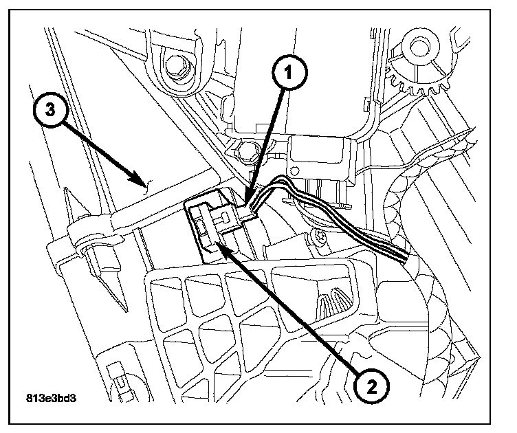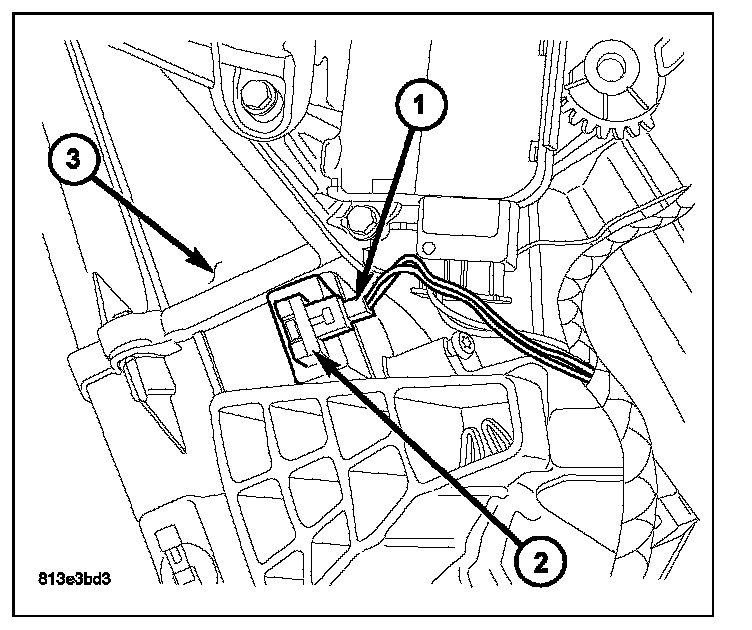 1. Install the evaporator temperature sensor (2) into the left side of the HVAC housing (3). Make sure that the sensor retaining clips are fully engaged in the housing.
