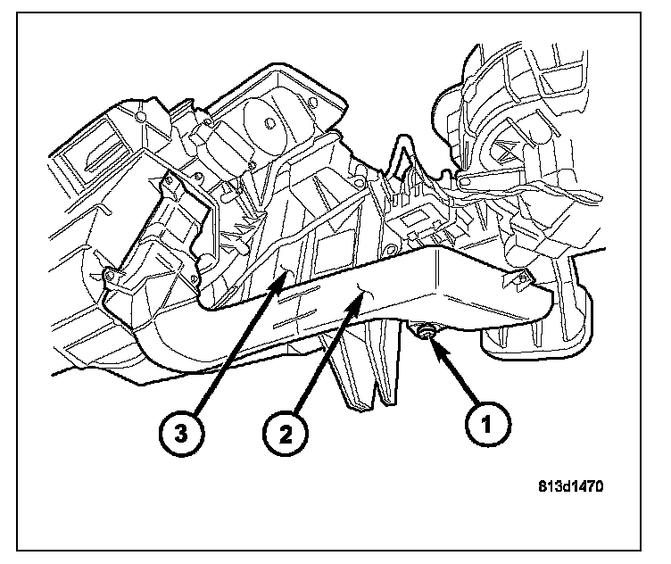 5. Remove the five screws (1) that secure the heater core and tube cover (2) to the HVAC housing (3).