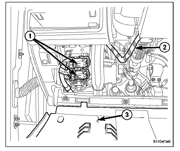 The molded plastic JB housing is secured with four screws and two snap retainers to the JB mounting bracket behind the instrument panel steering column opening cover (3). The steering column opening cover can be pulled downward to disengage the latches and provide service access to all of the fuses, relays and wire harness connectors (1) of the JB. Refer to Steering Column Opening Cover in Body.