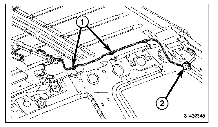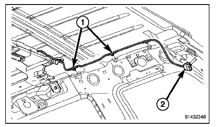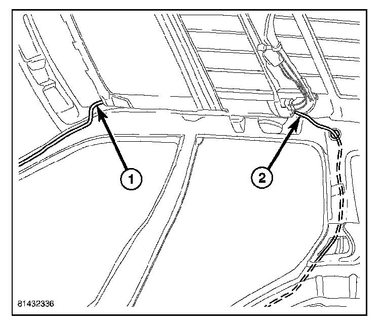 4. Disconnect the sunroof wire harness electrical connector (2) and separate the harness support clips (1) from the body.