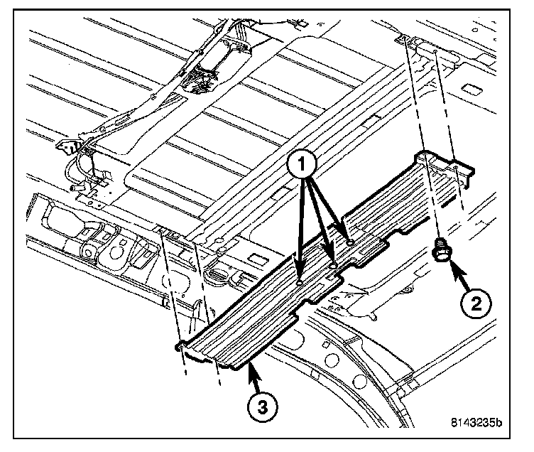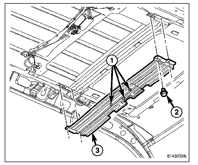 8. With the aid of a helper, support the sunroof and remove the fasteners (3) attaching sunroof assembly to roof panel.