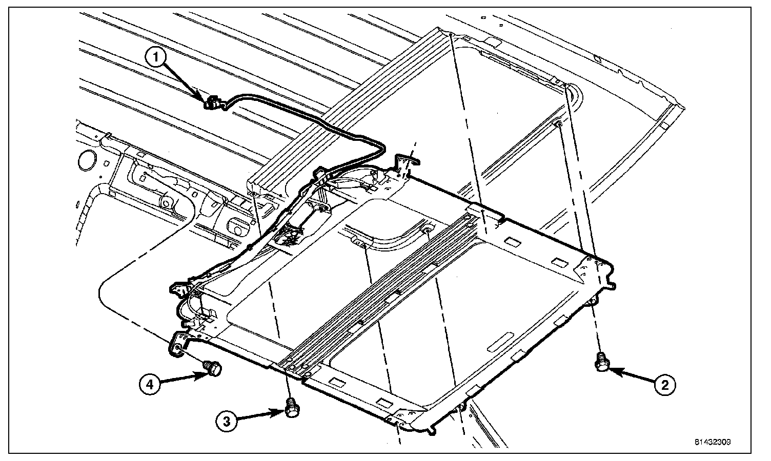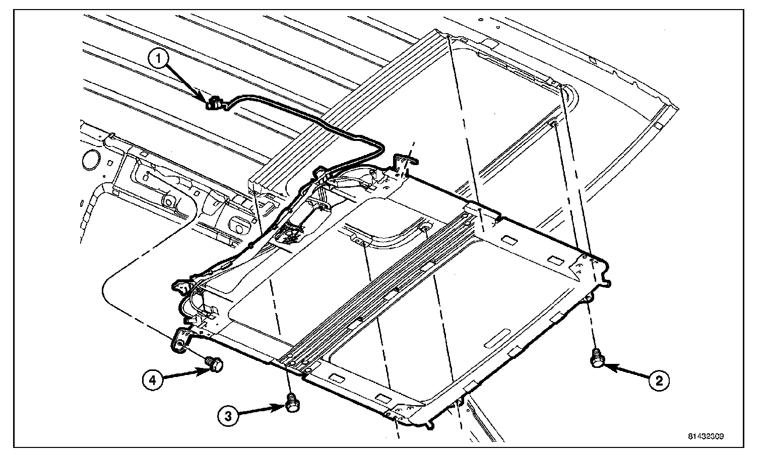 REMOVALWARNING: THE EXCESSIVE FORCE LIMITATION (EFL) FEATURE MUST BE CALIBRATED ANY TIME A SUNROOF MOTOR/MODULE IS REPLACED WITH A NEW COMPONENT. FAILURE TO PERFORM THIS PROCEDURE COULD RESULT IN VEHICLE DAMAGE AND/OR PERSONAL INJURY.