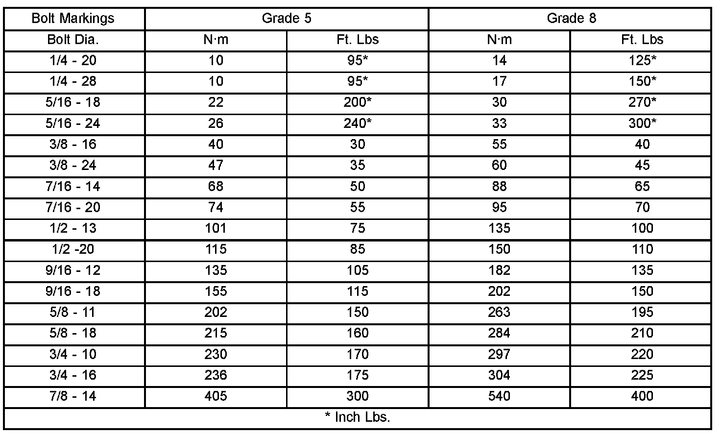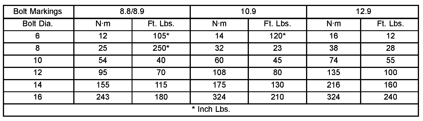 The SAE bolt strength grades range from grade 2 to grade 8. The higher the grade number, the greater the bolt strength. Identification is determined by the line marks on the top of each bolt head. The actual bolt strength grade corresponds to the number of line marks plus 2. The most commonly used metric bolt strength classes are 9.8 and 10.9. The metric strength class identification number is imprinted on the head of the bolt. The higher the class number, the greater the bolt strength. Some metric nuts are imprinted with a single-digit strength class on the nut face. Refer to the Fastener Identification and Fastener Strength Charts.