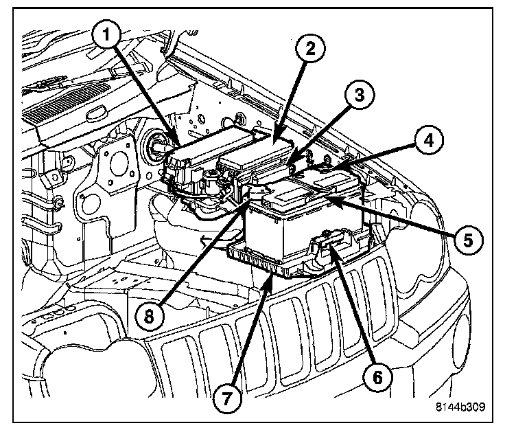 The IPM (2) is located in the engine compartment, next to the battery (5) and in front of the Power Distribution Center (PDC) (1). It is secured to a bracket with three locating slots that snap onto the bracket tabs holding it securely in place. The printed circuit board portion of the IPM cannot be repaired and must be replaced if inoperative or damaged.
