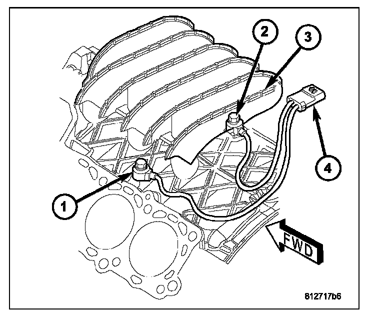 5. Connect knock sensor wiring harness to engine harness (4) at rear of intake manifold.