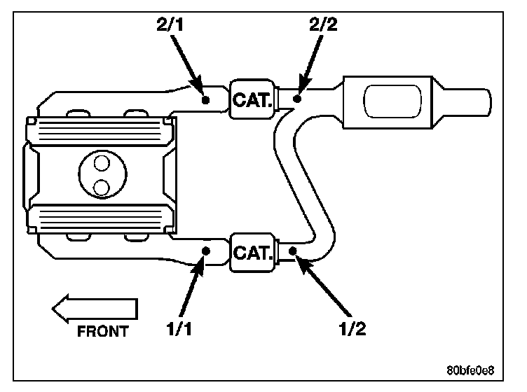 REMOVALRefer to graphic for typical O2S (oxygen sensor) locations if equipped with four oxygen sensors.