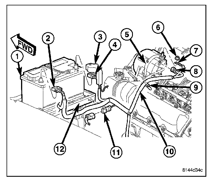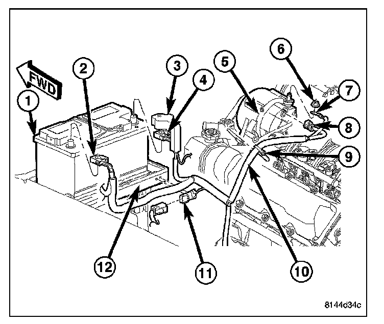 6. Install the battery wire harness three pin connector (11) onto the battery tray (12).