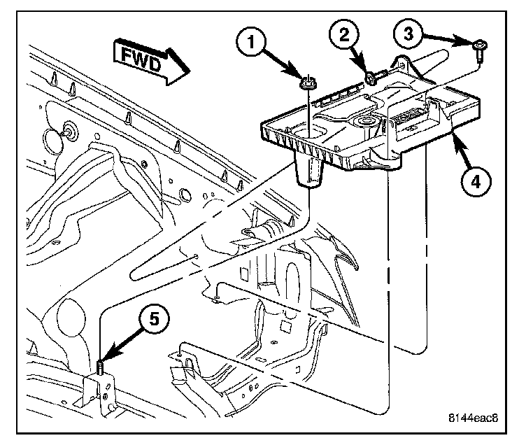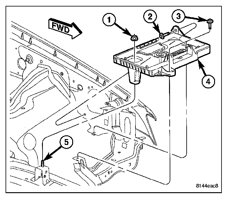 5. Remove the one nut (1) that secures the rear of the battery tray to the stud (5) on the front frame rail.