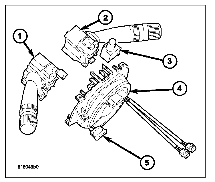 This vehicle is equipped with a Steering Control Module (SCM) (4) that houses an integral, internal clock-spring. On some models, the SCM also includes an integral, internal Steering Angle Sensor (SAS). The SCM is secured near the top of the steering column below the steering wheel and is completely concealed beneath the steering column shrouds. The SCM is installed as a modular unit that supports the left (lighting) multi-function switch (1), the right (wiper) multifunction switch (2), and the hazard switch (3). The controls for each of these switches extend through appropriate clearance holes provided in the steering column shrouds.