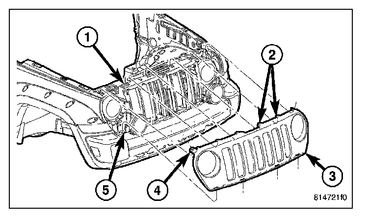 NOTE: The procedure to install the Renegade grille (3) is similar to the standard grille shown.