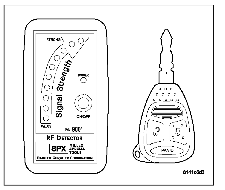 REMOTE KEYLESS ENTRY TRANSMITTERUsing special tool 9001, first test to ensure that the transmitter is functioning. Typical testing distance is 2.5 centimeters (1 inch) for Asian transmitters and 30.5 centimeters (12 inches) for all others. To test, position the transmitter as shown. Press any transmitter button, then test each button individually. The tool will beep if a radio signal strength that lights five or more LED's is detected. Repeat this test three times. If transmitter fails any of the test refer to the Diagnostic Procedures.