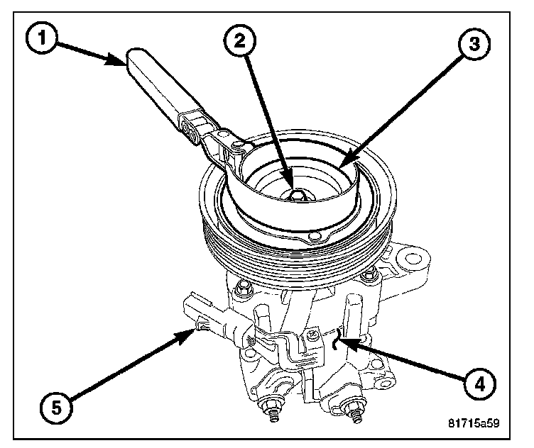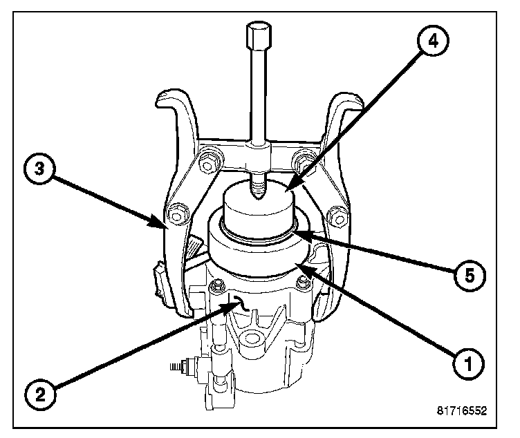2. Align the field coil positioning tabs to the recessed area at the front of the A/C compressor and install the clutch field coil onto the compressor using a two jaw puller (3), compressor field coil installer (Special Tool 9352 in Kit 9349) (4) and the compressor field coil installer spacer (Special Tool 9353 in Kit 9349) (5).