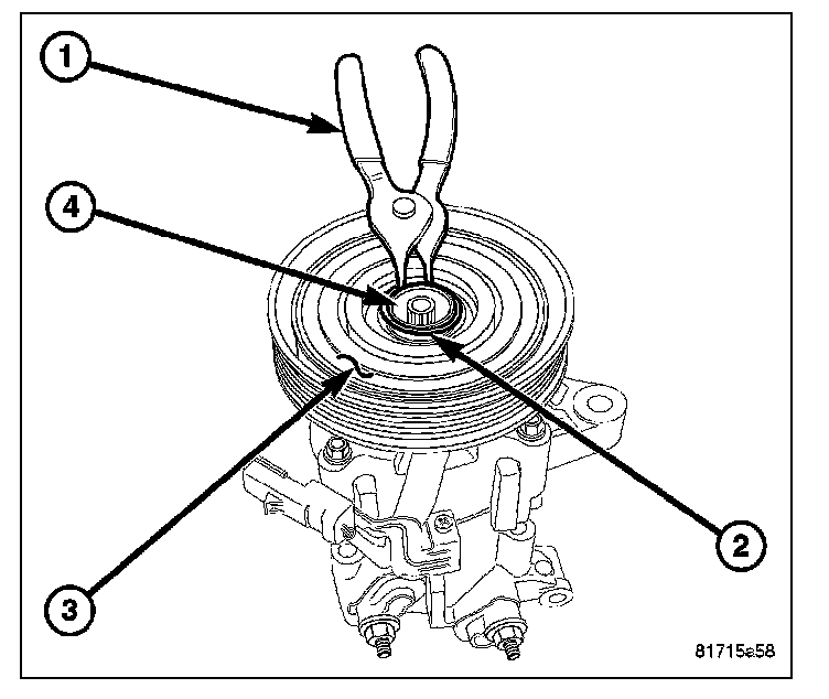 6. Using snap ring pliers (1), install the snap ring (2) that secures the pulley and bearing assembly (3) to the front of the A/C compressor (4). Make sure the snap ring is properly seated in the groove.