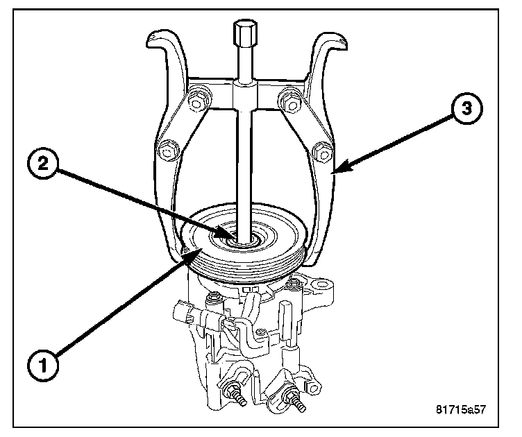 9. Remove the pulley and bearing assembly (1) from the front of the A/C compressor (2). If required, install a two jaw puller (3) and turn the puller center - bolt clockwise until the pulley and bearing assembly is completely removed.
