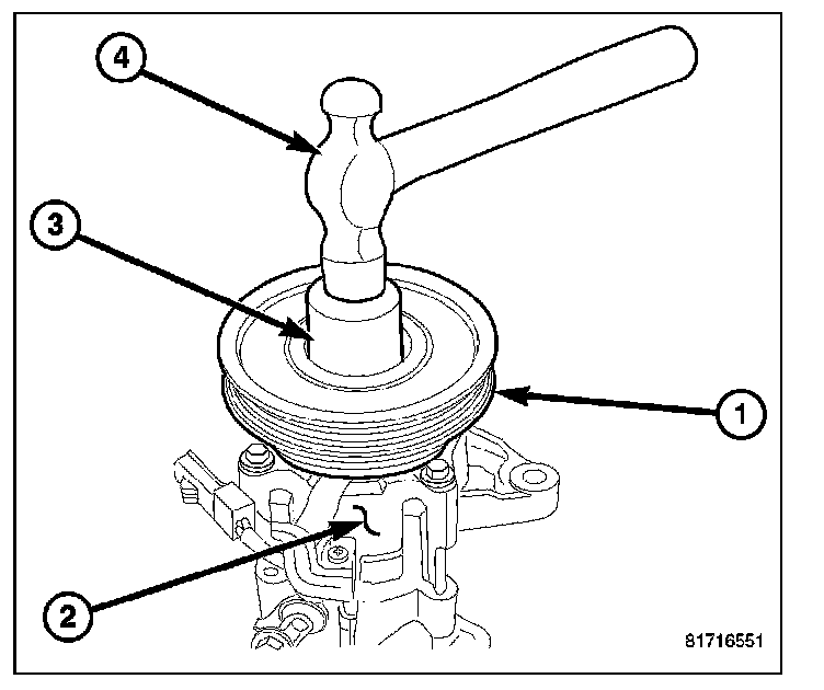 5. Using clutch pulley installer (Special Tool 9355 in Kit 9349) (3) and a hammer (4), install the pulley and bearing assembly onto the front of the A/C compressor. Tap the installer with a hammer until the pulley and bearing assembly has bottomed against the compressor housing.