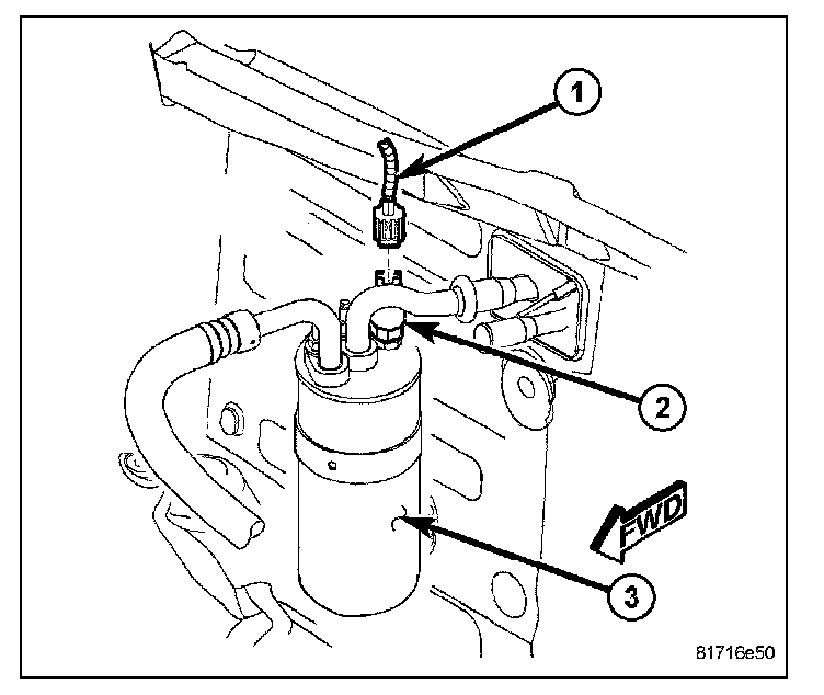 2. Install the A/C low pressure switch (2) onto the top of the A/C accumulator (3). Hand-tightened the switch securely.