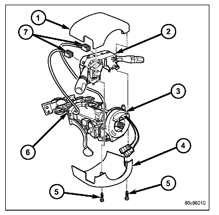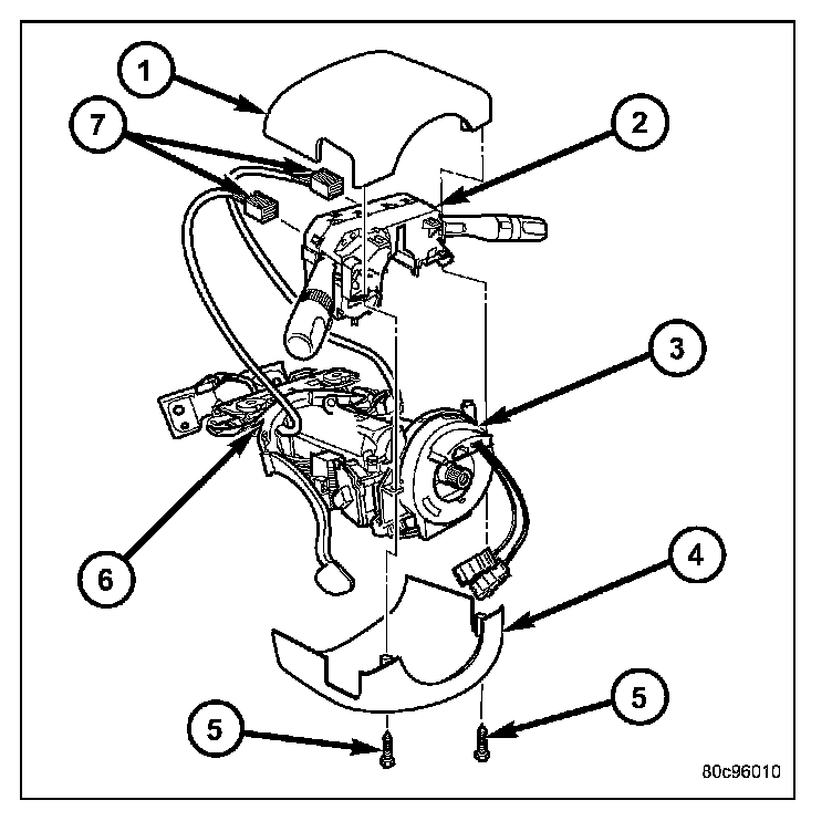 3. From below the steering column (6), remove the two screws (5) that secure the lower column shroud (4) to the upper shroud (1).