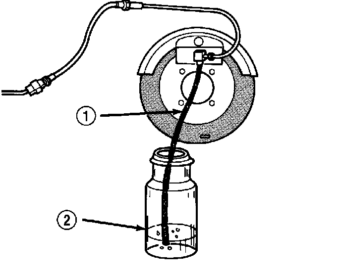3. Attach one end of bleed hose to bleed screw and insert opposite end in glass container partially filled with brake fluid. Be sure end of bleed hose is immersed in fluid.
