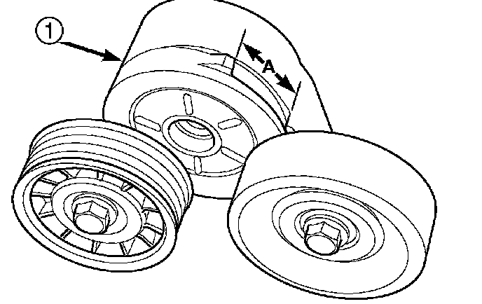 3. With the drive belt installed, inspect the belt wear indicator. On 3.7L Engines the gap between the tang and the housing stop (measurement A) must not exceed 24 mm (0.94 inches).