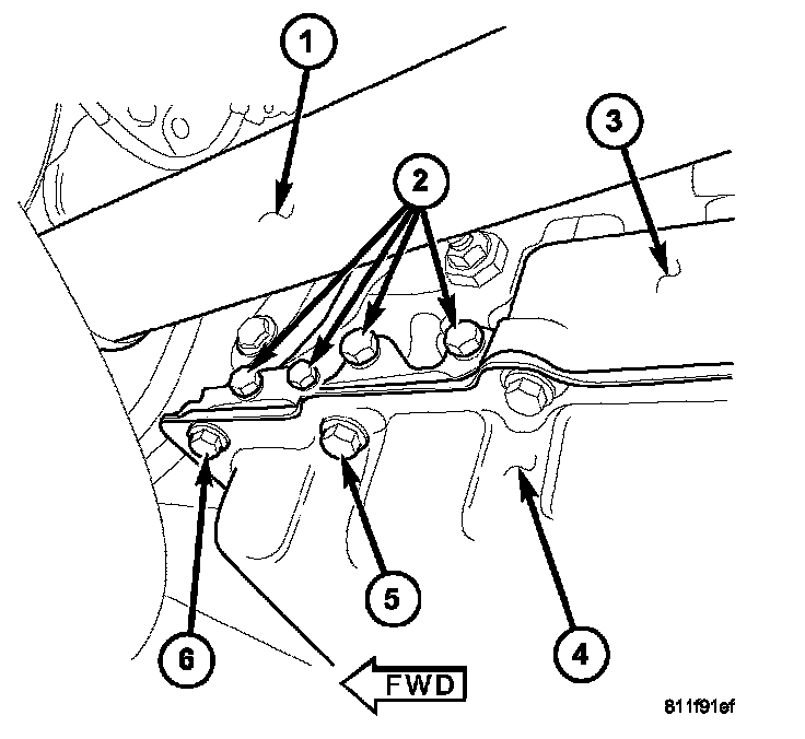 NOTE: Before installing the oil pan bolt (5) in the bolt hole located between the torque converter clutch on and U/D clutch pressure tap circuits, it will be necessary to replenish the sealing patch on the bolt using Mopar(R) Lock & Seal Adhesive.