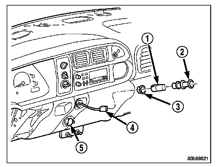 6. Pull the receptacle base away from the instrument panel (4) far enough to access the instrument panel wire harness connector (2).