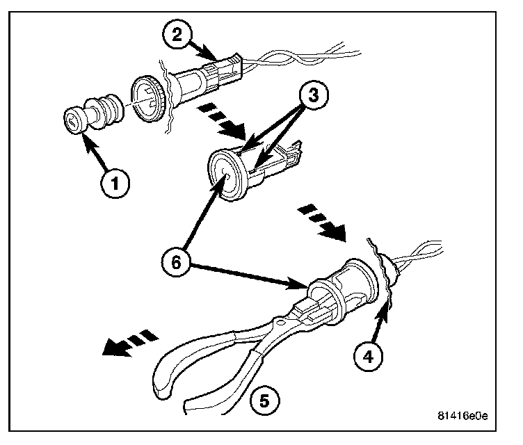 4. Insert a pair of external snap ring pliers (5) into the cigar lighter or power outlet receptacle base (6) and engage the tips of the pliers with the retaining bosses (3) of the mount.