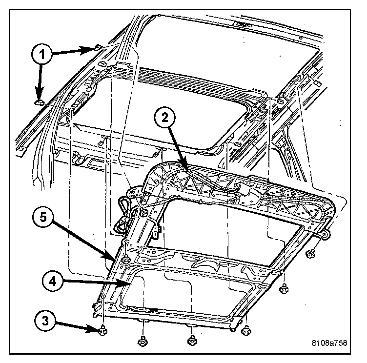 10. With the aid of a helper, remove fasteners attaching sunroof module assembly to roof panel.