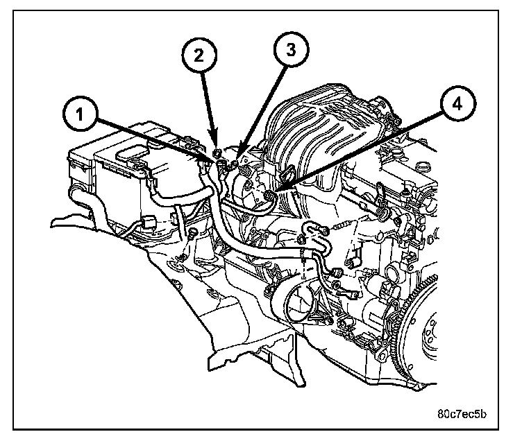 2. 3.7L Engine: Position generator to engine and install three mounting bolts (2) and (3). Tighten 2 horizontal mounting bolts to specified torque. Tighten 1 vertical mounting bolt and tighten to 40 N.m (29 ft. lbs.)