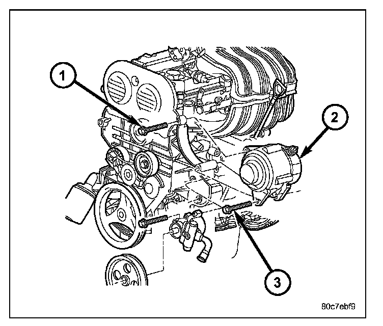 6. 2.4L Engine: Remove 2 generator mounting bolts (1) and (2).