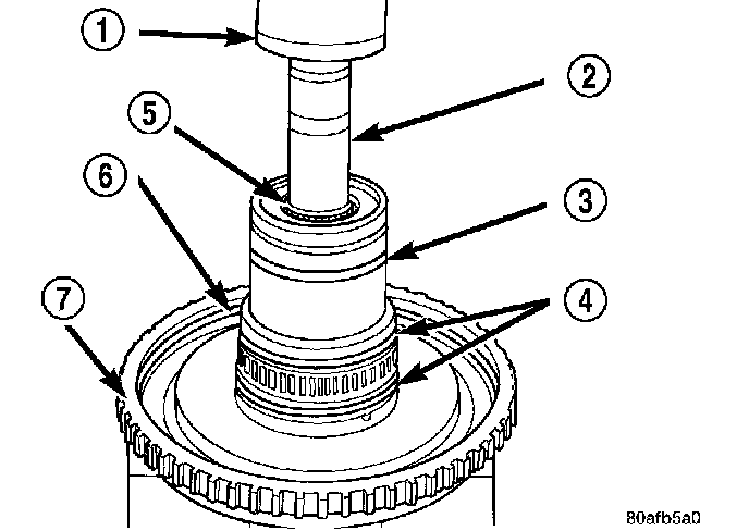 4. Using an arbor press (1) and Disc 6057 (4), install the OD/Reverse piston return spring (6) and snap ring (3).