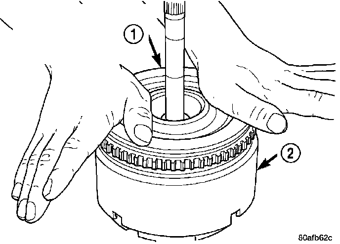 6. Install the input hub/shaft assembly (1) to the OD/Reverse piston/clutch retainer assembly (2).