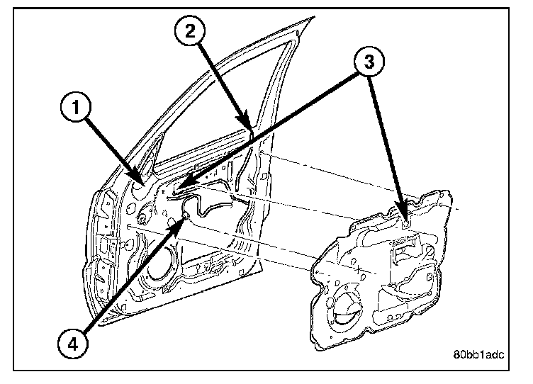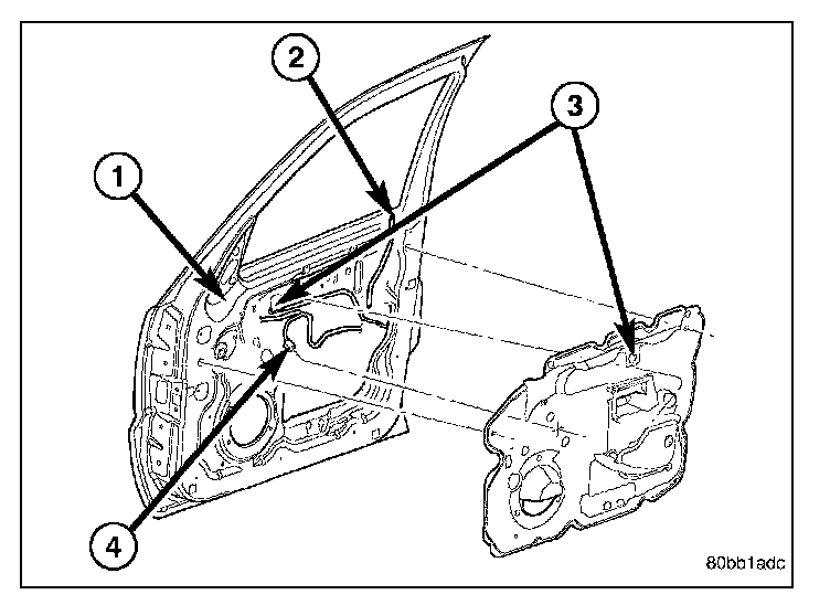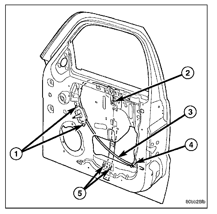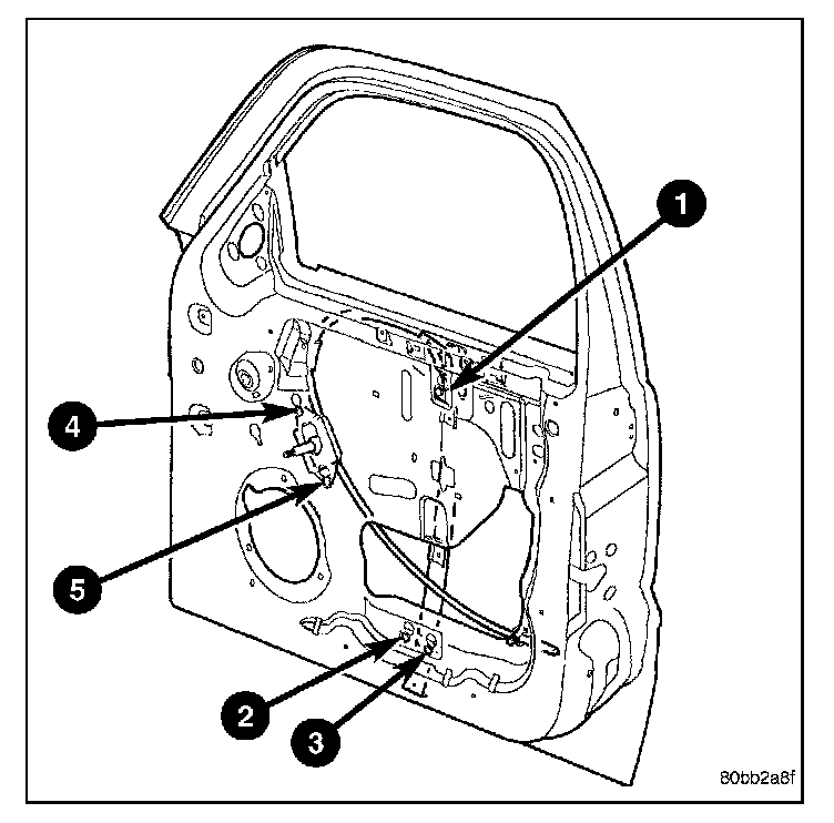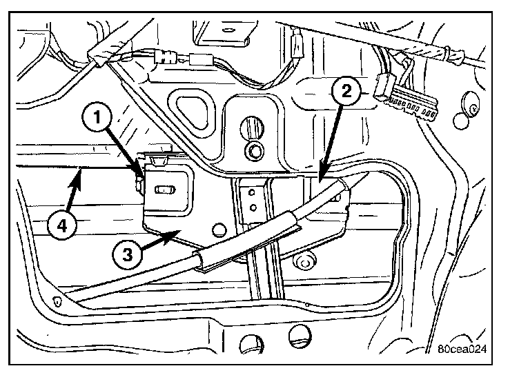 2. Raise the glass (4) to the position shown and using a long flat blade or hook type tool, disengage clips (1) attaching glass retainer to regulator lift plate (3).