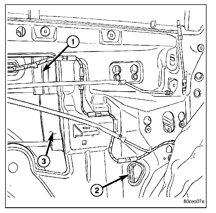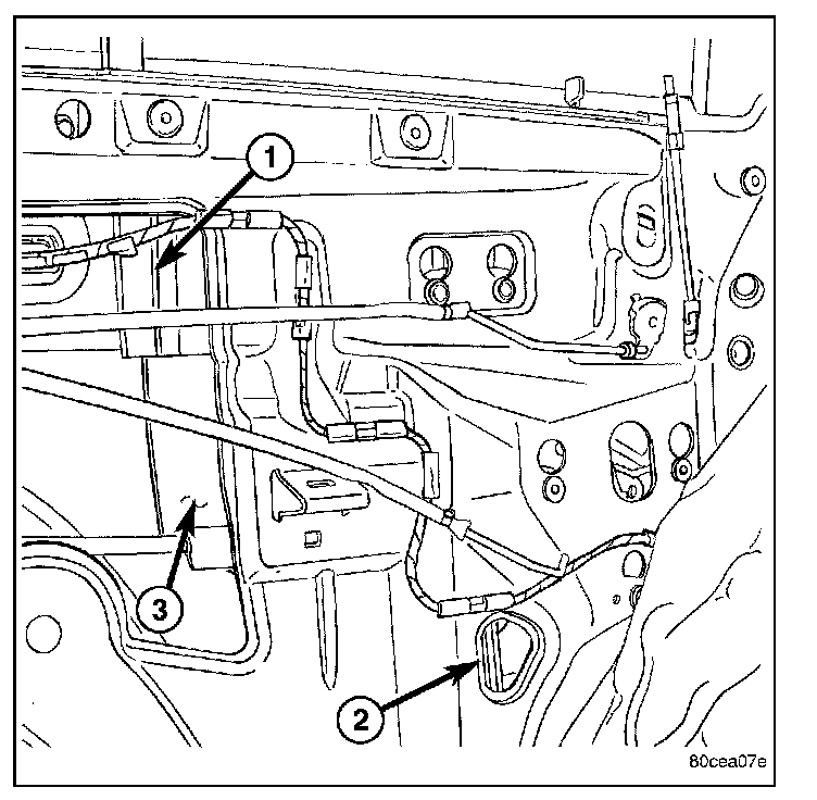 3. Using a long flat blade or hook type tool, disengage the clip (2) attaching glass retainer to regulator lift plate.