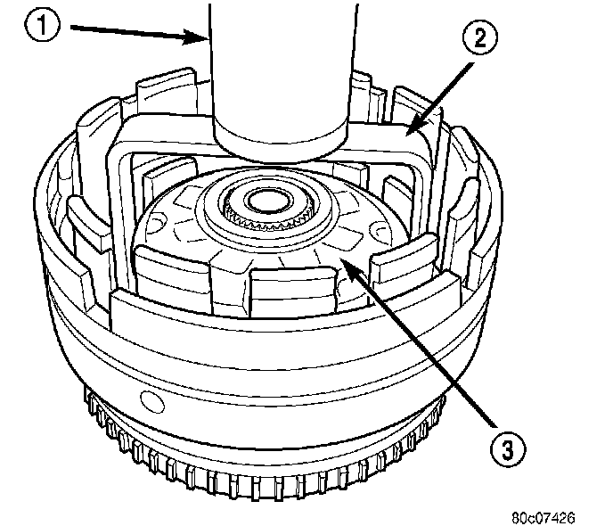 15. Using Spring Compressor 8251 (2), compress the UD/OD balance piston (3) and remove the snap-ring from the input clutch hub.