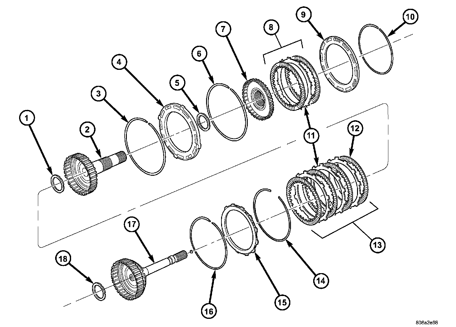 1. Remove the reverse reaction plate selective snap-ring (10) from the input clutch retainer (13).
