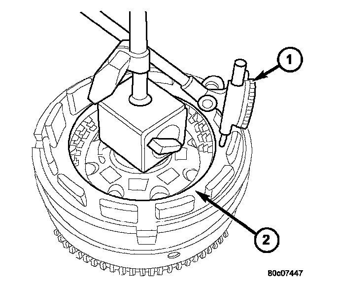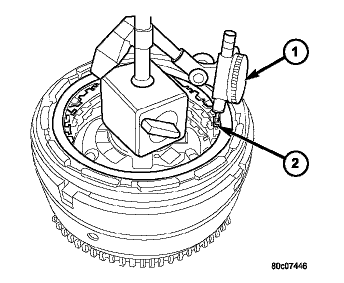 22. Mount a dial indicator to the assembly and zero the indicator against the OD/Reverse reaction plate (2). Apply 20 psi of air pressure to the overdrive clutch and record the dial indicator reading. Measure and record OD clutch pack measurement in four (4) places, 90° apart. Take average of four measurements and compare with OD clutch pack clearance specification. Verify that the clutch clearance is 1.103 - 1.856 mm (0.043 - 0.073 inch). The reaction plate is not selective. If the clutch clearance is not within specification, replace the reaction plate along with all the friction and steel discs.