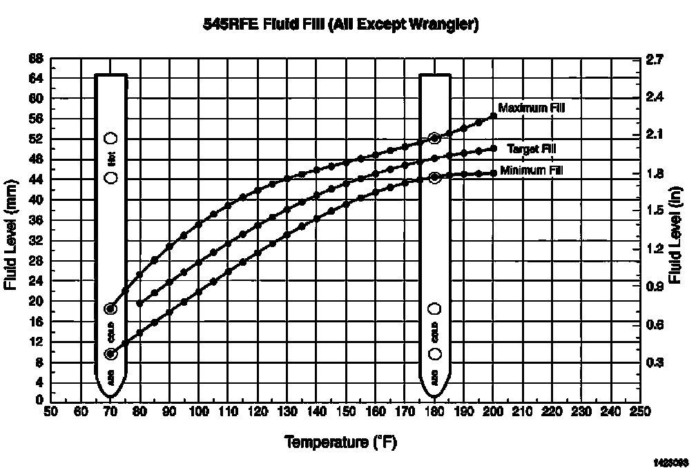 9. Adjust transmission fluid level shown on the dipstick according to the Transmission Fluid Temperature Chart.