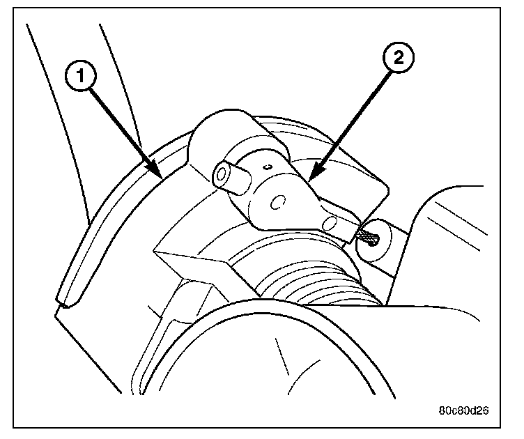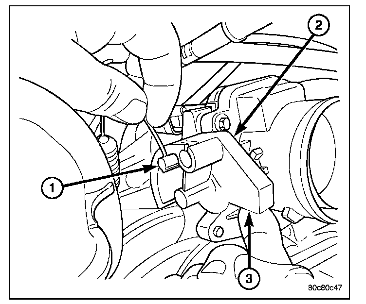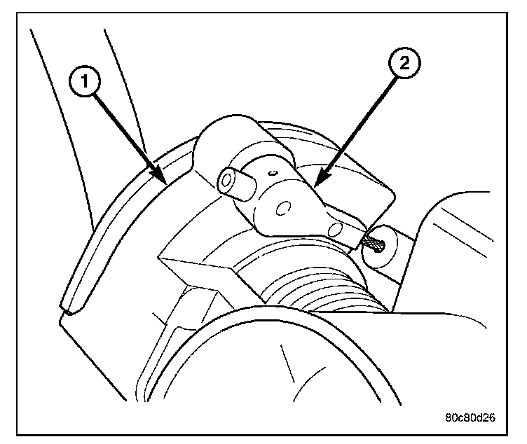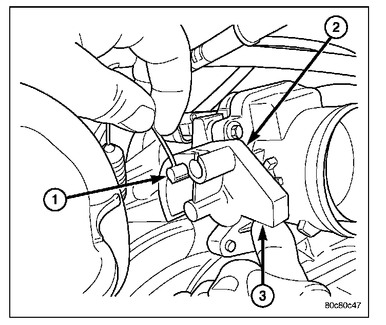 5. Using finger pressure only, disconnect servo cable connector (2) at throttle body bellcrank pin by pushing connector off bellcrank pin towards front of vehicle. DO NOT try to pull connector off perpendicular to the bellcrank pin. Connector will be broken.