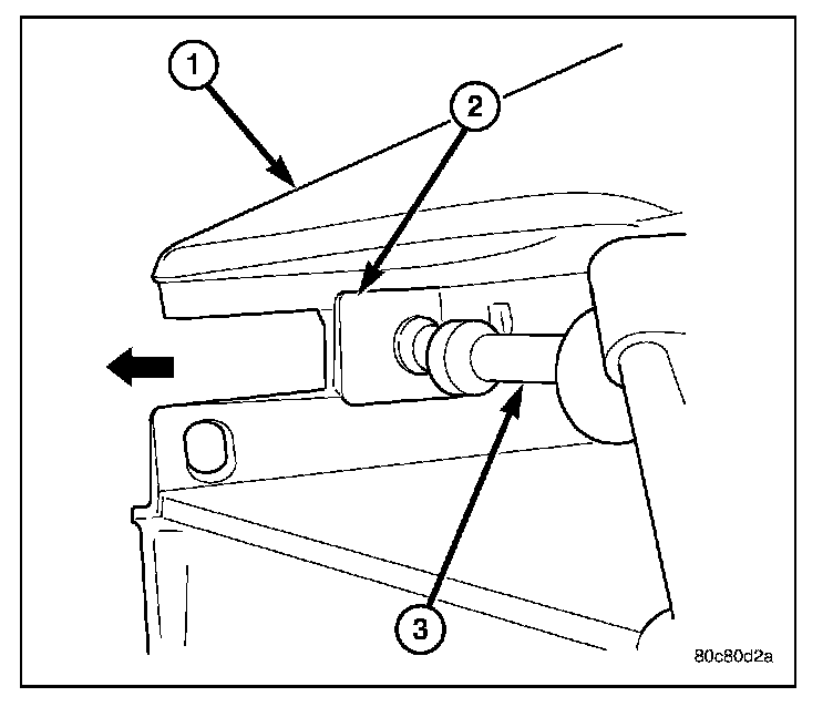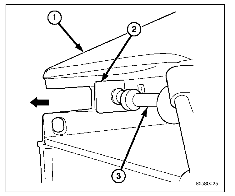 6. Slide speed control cable plastic mount (2) towards right of vehicle to remove cable from throttle body bracket.