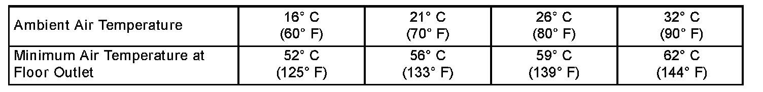 Engine coolant is delivered to the heater core through two heater hoses. With the engine idling at normal operating temperature, set the temperature control to the full hot position, the mode control to the floor position, and the blower motor control to the highest speed position. Using a test thermometer, check the temperature of the air being discharged at the front floor outlets. Compare the test thermometer reading to the Heater Temperature Reference chart.