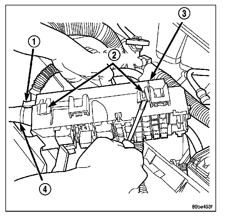 5. Where the headlamp and dash wire harness exits the PDC, remove the tape that secures the wire harness to the trough formation on the PDC housing lower cover.