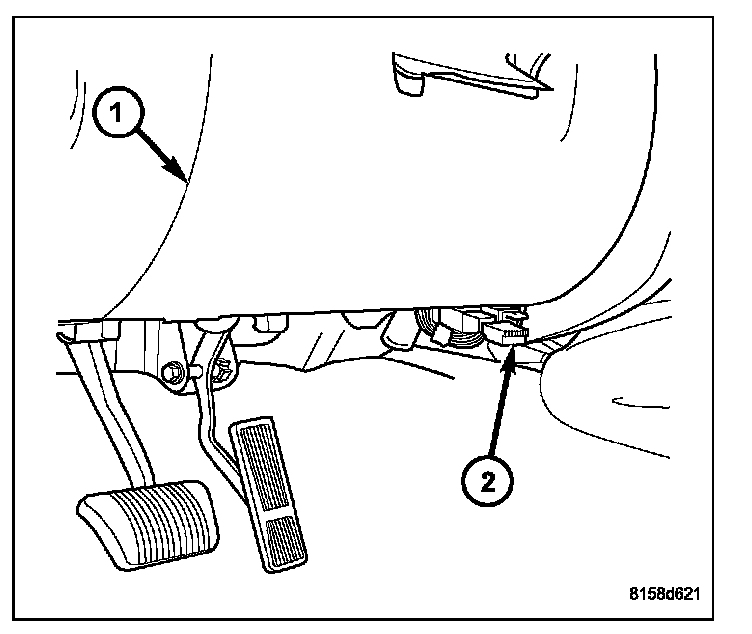 The Data Link Connector (DLC) (2) is a 16-way molded plastic connector insulator on a dedicated take out of the instrument panel wire harness. This connector is located at the lower edge of the instrument panel, inboard of the steering column. The connector insulator is retained by two screws through two integral mounting tabs to the lower instrument panel reinforcement, just below the lower edge of the instrument panel steering column opening cover (1).
