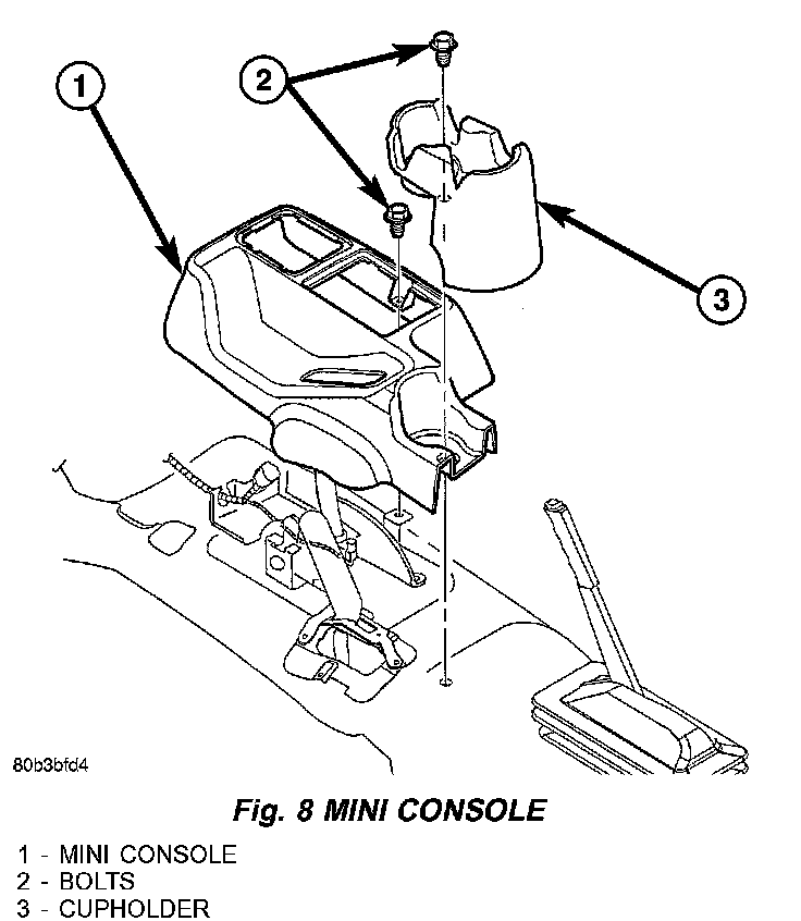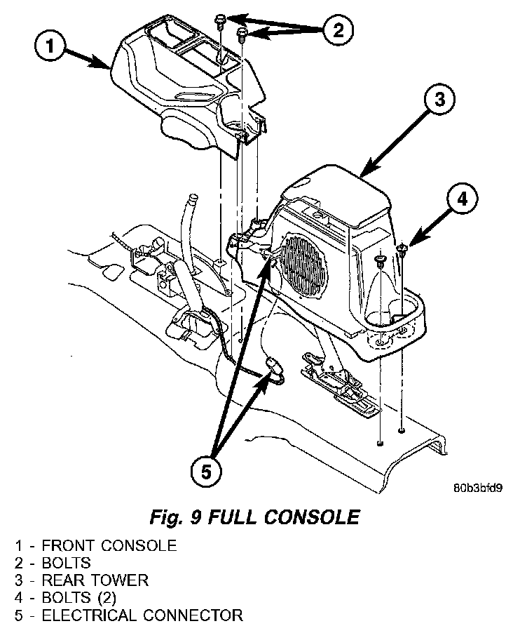5. Remove the bolt(s) attaching the console to the floor pan (Fig. 8) and (Fig. 9).