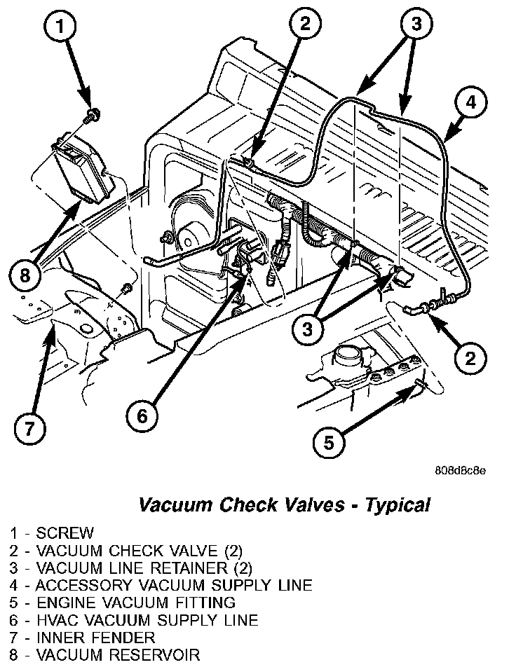 1. Disconnect the vacuum check valve from the fitting at the engine intake manifold and the accessory vacuum supply line and remove the valve.
