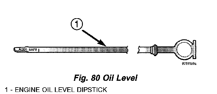 Checking the oil while the vehicle is on level ground will improve the accuracy of the oil level reading. Remove dipstick and observe oil level. Add oil only when the level is at or below the ADD mark (Fig. 80).