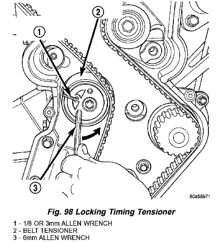 10. Install 6 mm Allen wrench into belt tensioner. Before rotating the tensioner, insert the long end of a 1/8" or 3 mm Allen wrench into the pin hole on the front of the tensioner (Fig. 98). While rotating the tensioner counterclockwise, push in lightly on the 1/8" or 3 mm Allen wrench, until it slides into the locking hole.