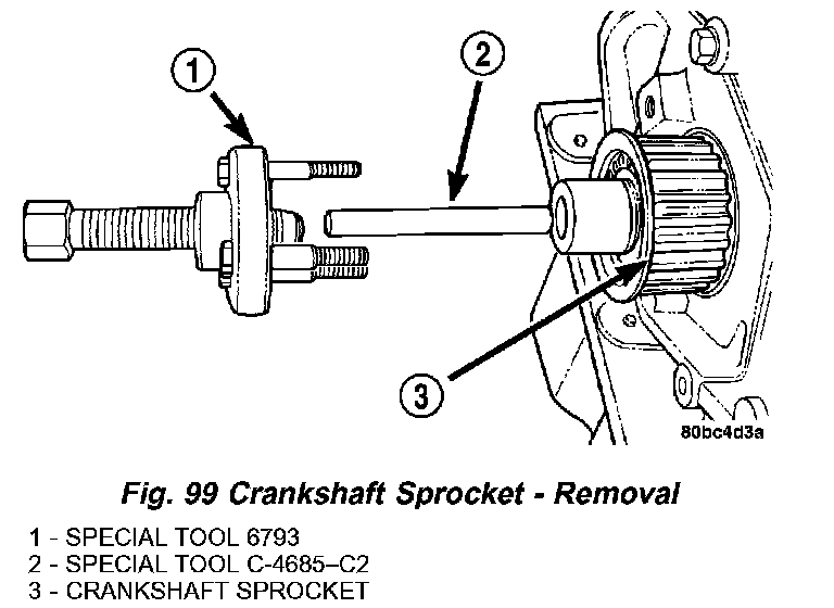 3. Remove crankshaft sprocket using Special Tools 6793 and insert C-4685-C2 (Fig. 99).