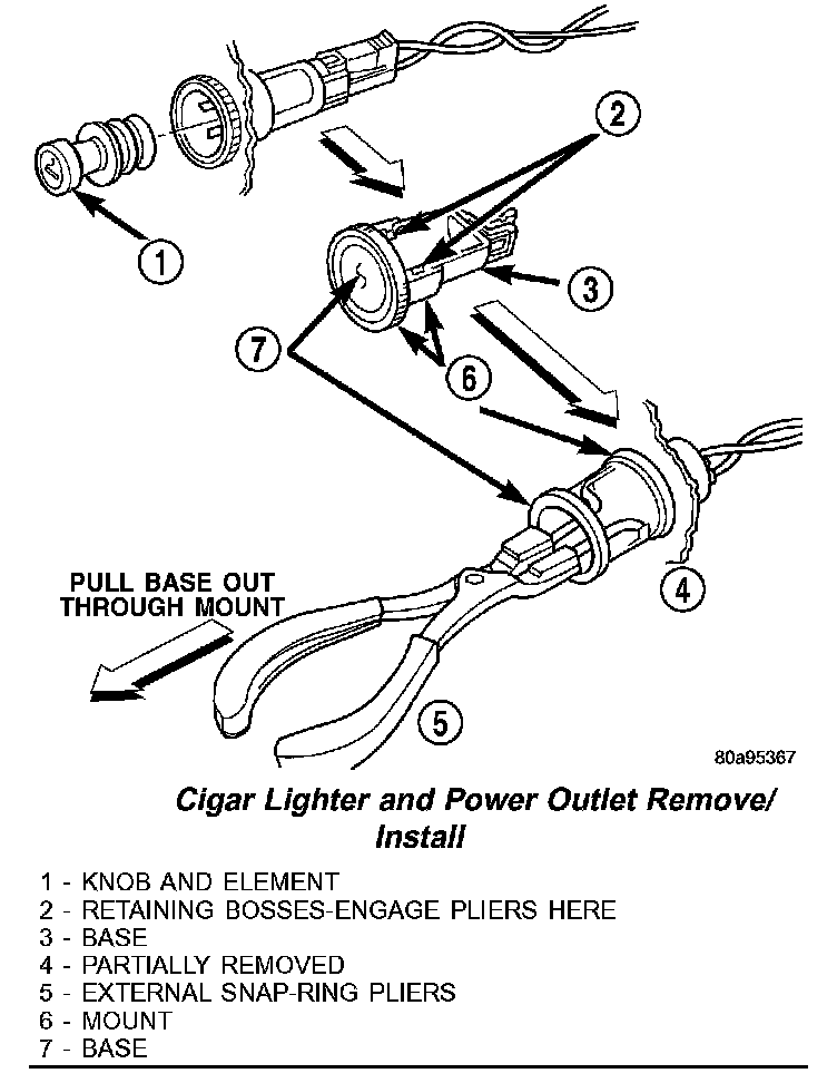 4. Insert a pair of external snap ring pliers into the cigar lighter or power outlet receptacle base and engage the tips of the pliers with the retaining bosses of the mount.