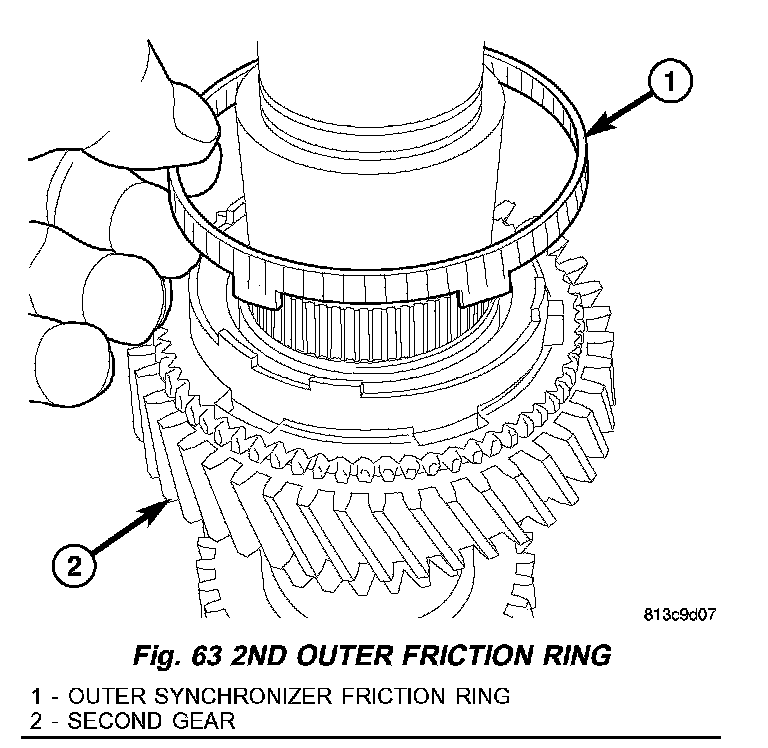 5. Install outer synchronizer friction ring (1) (Fig. 63) on second gear (2).