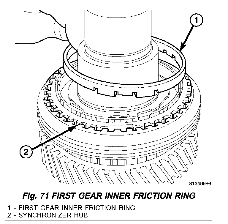 13. Install first gear inner friction ring (1) (Fig. 71) into synchronizer hub (2).